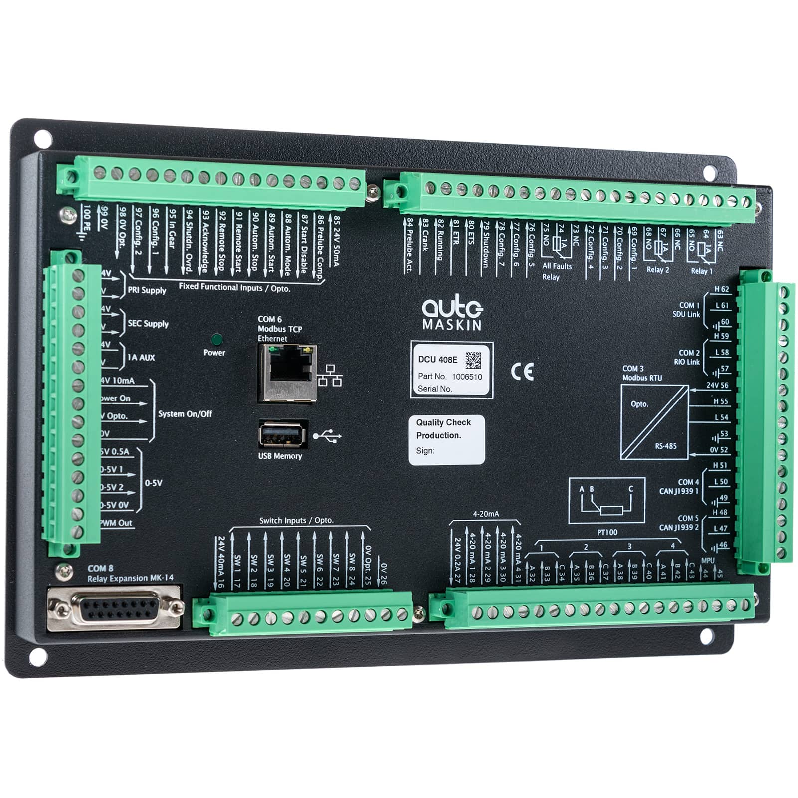 DCU 408E er grunnmodulen for å bygge et overvåkingssystem for både variabel hastighet (fremdrift eller pumper) eller fast hastighet (generatorsett) dieselmotorer. Den gir samme funksjonalitetsnivå som DCU 410E Motorkontroller, men er uten display og inngangsknapper.